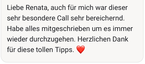 Hier hast du direkten Zugang zu uns drei - deinen persönlichen Mentorinnen und Begleiterinnen auf dem Weg zu deiner Veränderung. Stelle dir vor, du könntest jederzeit Fragen stellen, um Rat bitten und deine Erfolge teilen, und das alles in einer vertrauten und unterstützenden Umgebung. 7 Wochen lang kannst du täglich so oft du möchtest Fragen stellen, und auf jede Frage bekommst du von uns eine Antwort, in einem geschützten Raum, alles bleibt unter uns, Renata, Michelle, Sylvia und Dir. Diese direkte Verbindung ist wie ein Kraftstoff für deine Transformation, der dich dazu bringt, weiter zu gehen und höher zu fliegen als je zuvor.